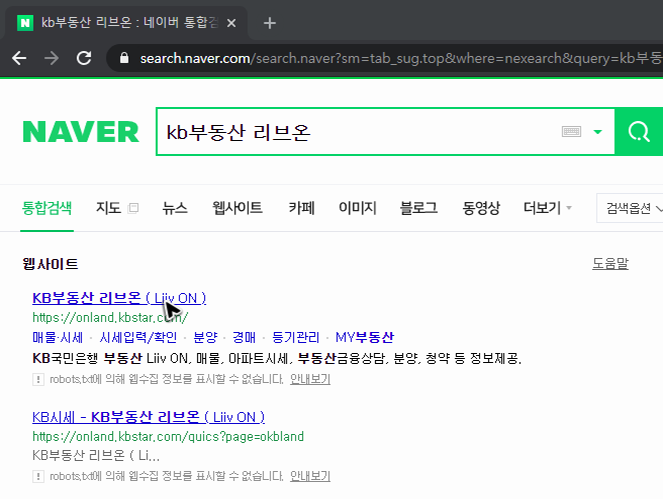 혹시 저처럼 다른 곳을 통해서 부동산에 대한 정보를 확인해보고 싶으시다면, 마찬가지로 포털에서 검색하면 됩니다. 아니면 주소창에 [onland.kbstar.com]를 입력해서 조금 더 빠르게 찾아갈 수도 있어요.
