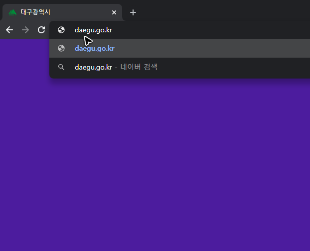 루트를 아는 사람만 비밀스럽게 찾아갈 수 있는 그런 사이트가 아니죠? 누구에게나 오픈되어 있는 페이지이고, 포털에서 검색하면 빠르게 찾아갈 수 있습니다. 다만, 검색한다는 것 자체가 조금 귀찮은 구석이 있어요. 그러니 주소창에 [daegu.go.kr]를 입력해서 대구시청의 홈페이지로 바로가기를 해주세요. 물론 번거롭지 않으시다면 검색하셔도 됩니다.