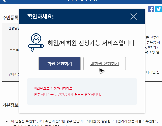 메뉴를 누른 뒤에는 상세 안내 페이지로 연결될 거예요. 그리고 신청하기 버튼을 볼 수 있습니다. 안내되는 내용을 충분히 살펴본 뒤에는 신청 버튼을 눌러주세요. 그럼 로그인에 관한 알림이 나오는데, 로그인을 하지 않아도 주민등본을 열람하고 발급하는 것이 그낭해요.