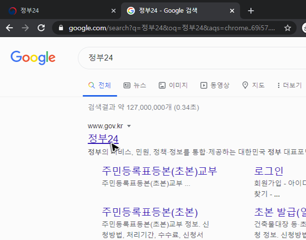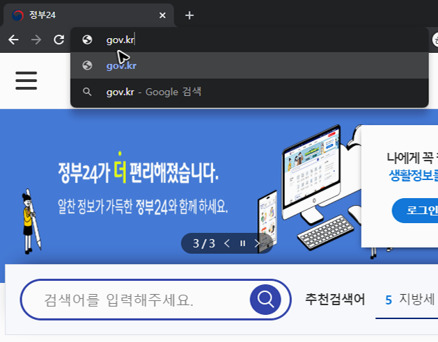 정부24시 홈페이지 역시 먼저 찾아간 곳과 마찬가지로 포털에서 검색을 하면 방문할 수 있습니다. 조금 더 빠르게 방문을 하려면 주소창에 [gov.kr]을 복사해서 붙인 뒤에 엔터를 눌러주세요.