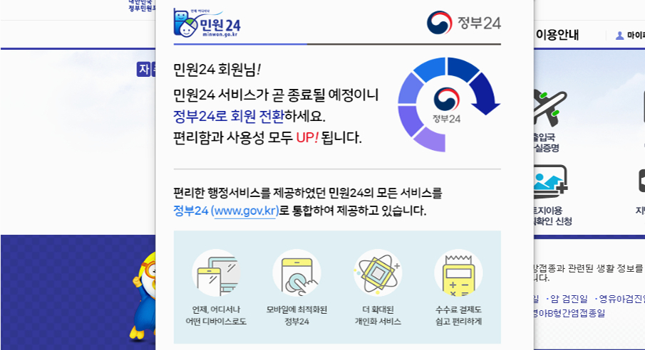 검색하거나 위에 적어둔 주소를 복사해서 사이트를 방문해보시면 팝업화면이 하나 띄워질 거예요. 그리고 그 내용을 보면 민원24의 모든 행정서비스가 정부24로 옮겨진다는 것을 알 수 있습니다. 고로 당장에는 지금 찾아온 사이트를 이용하는데 문제가 없지만, 어차피 사라질 예정이니 그냥 정부24에서 등본이나 전입신고, 납세 증명서 발급 등의 민원 업무를 처리하는 것을 권장합니다. 정부24에 대해서는 아래쪽에서 알아볼게요.