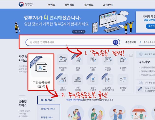 아니면 홈페이지의 중간 영역에 있는 자주 찾는 서비스를 확인해주세요. 첫 번째에 주민등록등본(초본)이라 적힌 메뉴가 보일 것입니다. 물론 클릭하면 됩니다.
