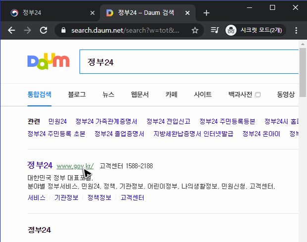 꽁꽁 숨겨진 사이트라서 루트를 아는 사람만 찾아갈 수 있는 그런 곳이 아니죠? 모두에게 공개된 사이트이고, 포털에서 검색하면 빠르게 찾아갈 수 있는 곳입니다. 다만, 검색하는 게 귀찮다는 함정이 있어요. 그러니 브라우저 주소창에 [gov.kr]를 입력해서 정부24의 주민등록등본을 인터넷발급하는 곳으로 이동해주세요.