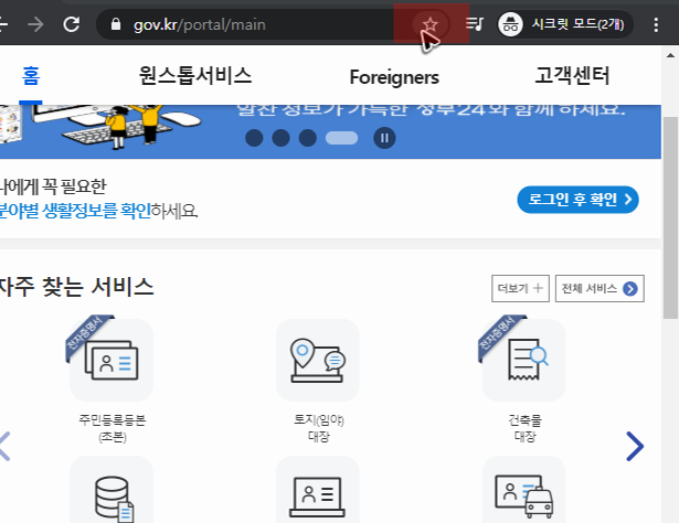아무래도 지원해주는 서비스 종류가 다양하다 보니, 다시 찾아와야 할 상황이 또 생길 수 있습니다. 그런데 재방문을 할 때 검색을 새롭게 해보는 것이 번거로우시다면, 이번에 북마크에 추가해두는 것이 하나의 방법이 될 수 있어요. 주소창 오른쪽에 보면 별표 모양의 버튼이 있는데, 그 버튼을 누르면 브라우저 북마크 목록으로 구성할 수가 있습니다.